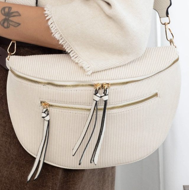 Pratique et tendance, cette sacoche en velours côtelé allie confort et style. Dotée d’une large bandoulière tissée de 5 cm, amovible et ajustable, elle se porte aussi bien à l’épaule qu’en crossbody pour un look décontracté et moderne. Ses deux fermetures éclairs garantissent praticité et sécurité, tandis que la poche arrière zippée offre un rangement supplémentaire.